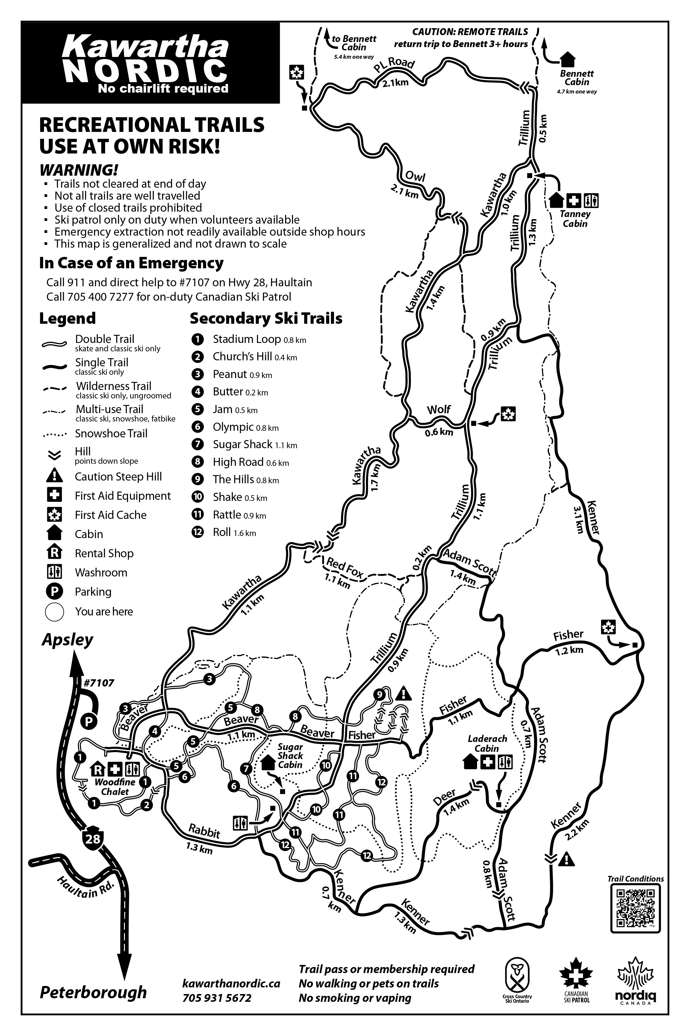 Ski trails: Our ski trail map below is posted at every trail junction, but is also available for download in a larger version.